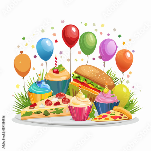Colorful illustration of a celebratory gathering featuring pizza, cupcakes, a sandwich, and balloons, perfect for birthday parties or festive events.