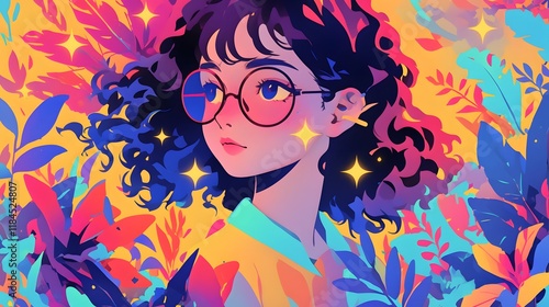 Colorful illustration of a girl with curly hair and glasses, surrounded by vibrant flowers and glowing stars
