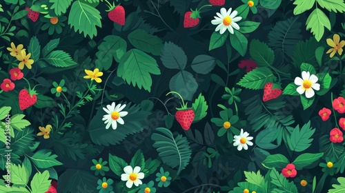 Colorful illustration of a lush forest with strawberries and flowers blooming.