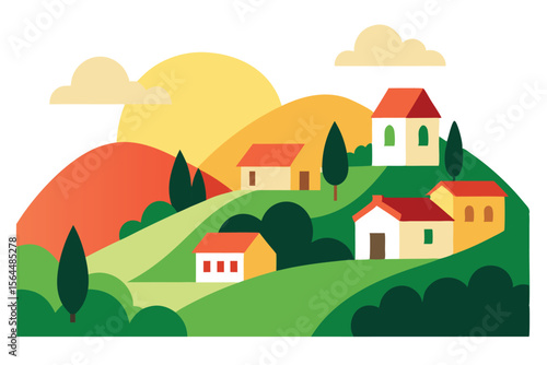 Colorful illustration of a picturesque village nestled in rolling hills at sunset.