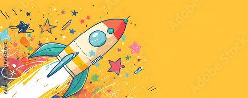 Colorful illustration of a rocket ship launching into space with stars and cosmic elements on a yellow background.