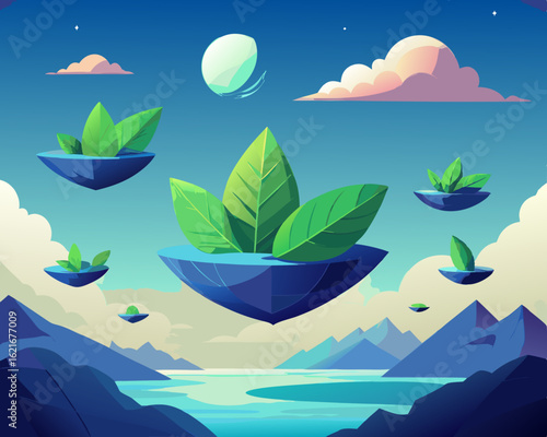 colorful illustration of a surreal herbal landscape with floating mint leaves