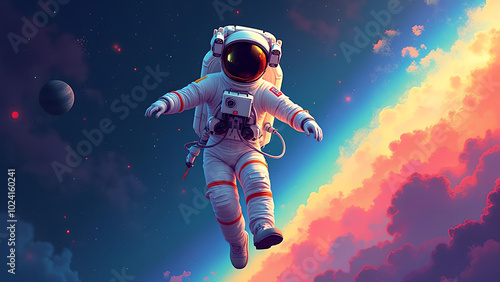 Colorful Illustration of an Astronaut Floating in Space Rainbow Spacewalk