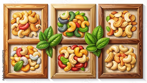 Colorful illustration of cashew nuts in various frames and arrangements, showcasing different styles and design elements in vector format.