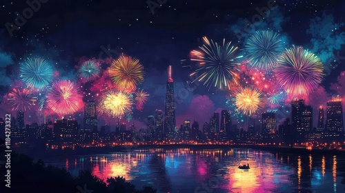 Colorful Illustration of Fireworks Exploding Over Cityscape at Night
