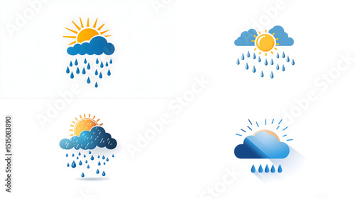 Colorful illustration of weather icons featuring sun clouds and raindrops for forecast designs