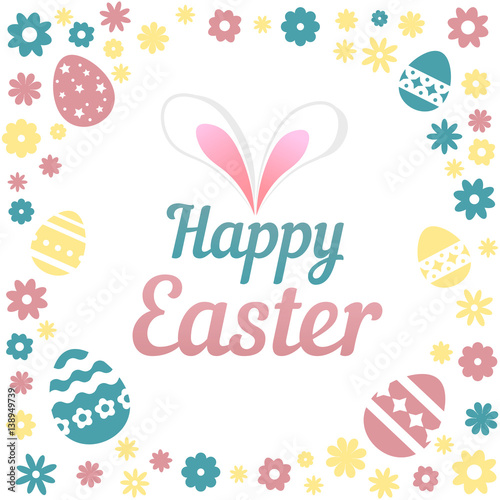 Colorful illustration with the title Happy Easter and flowers on white background.