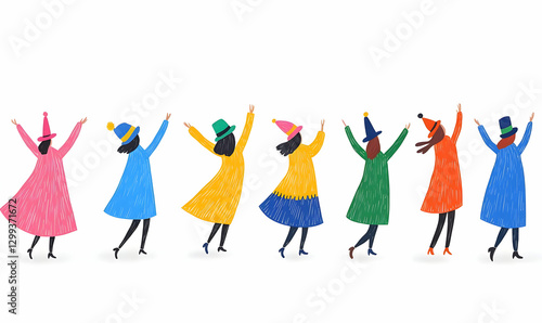 Colorful Illustrations of Cheerful Women in Stylish Dresses and Hats
