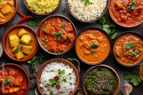 Colorful Indian Cuisine Variety with Rice, Curry, and Naan Bread