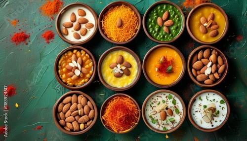 Colorful Indian Desserts and Sweets Displayed in Bowls with Almonds and Toppings