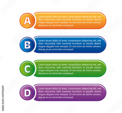 Colorful infographic with buttons- yellow, blue, green and purple.. There are four steps of template.