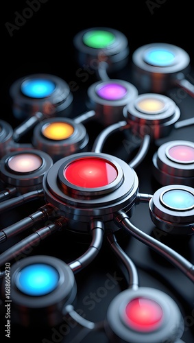 Colorful interconnected network of lights and metal pipes in a futuristic design