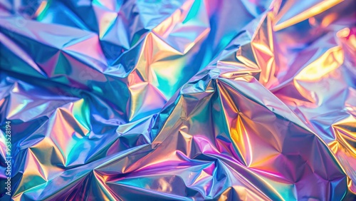 Colorful iridescent crumpled foil texture reflecting vibrant light, creating a holographic effect with metallic tones, ideal for abstract backgrounds, futuristic design, and creative visual concepts.