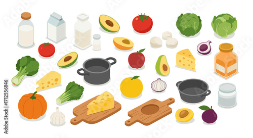 Colorful isometric kitchen ingredients set: fruits, vegetables, dairy, spices, cooking