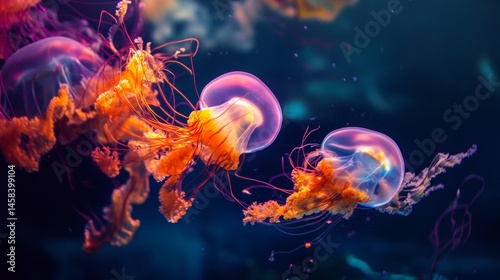 Colorful jellyfish floating in deep ocean dark background in surreal aquatic fantasy nature scene
