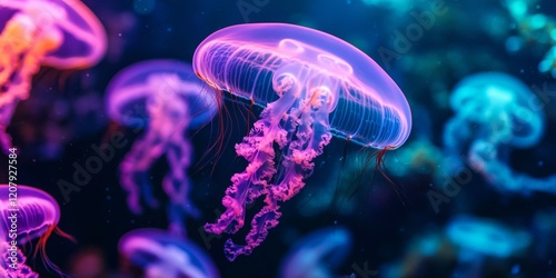 Colorful jellyfish swim gracefully in the ocean. This vibrant scene captures their ethereal beauty. Perfect for nature lovers and art enthusiasts. Explore the mesmerizing underwater world. AI