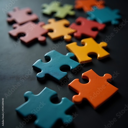 Colorful Jigsaw Puzzle Pieces on Dark Background – Close-Up Contrast and Playful Composition