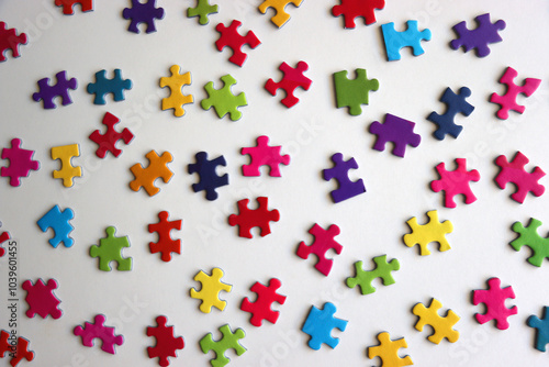 Colorful jigsaw puzzle pieces on white background. Flat lay.