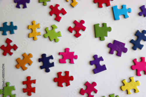 Colorful jigsaw puzzle pieces on white background. Flat lay.