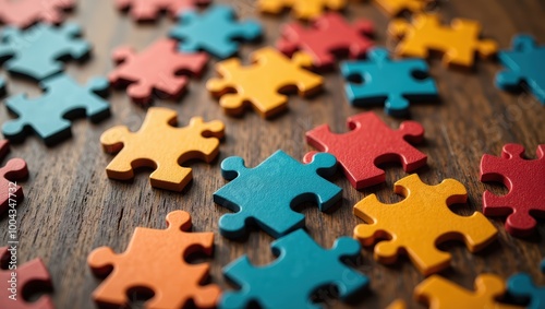 Colorful Jigsaw Puzzle Pieces on Wooden Background