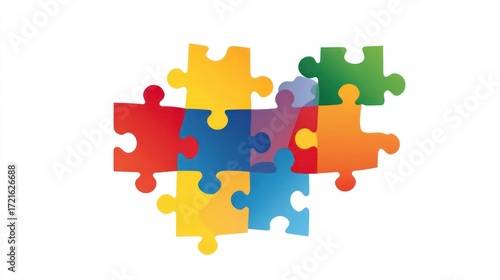 Colorful jigsaw puzzle pieces overlapping, forming a partially complete structure against white background
