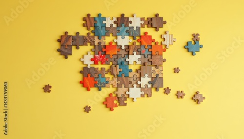 Colorful jigsaw puzzle pieces scattered on a yellow background