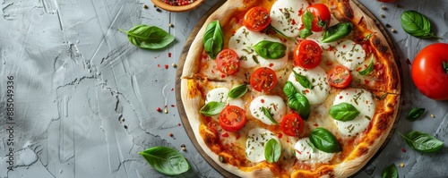 Colorful juicy tasty homemade pizza with vegetables, spicy spices and herbs on a dark background, top view perfect for home food recipe sites and food delivery app ads