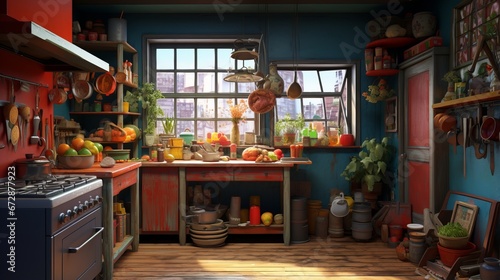 Colorful Kitchen Interior with Plants, Hanging Pots, and Rustic Decor