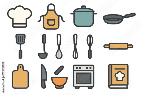 Colorful kitchen utensil icons featuring cooking tools and appliances