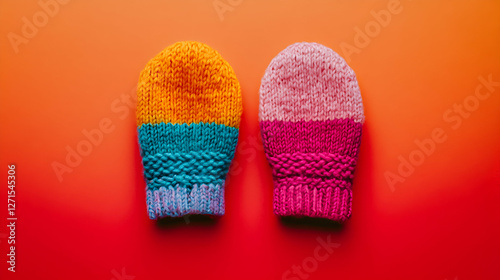Colorful knitted mittens displayed on a vibrant orange background for winter fashion inspiration