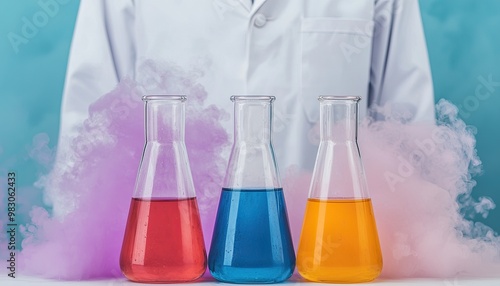 Colorful laboratory flasks with smoke, set against a vibrant background.