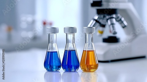 Colorful Laboratory Glassware with Blue and Orange Liquid Samples