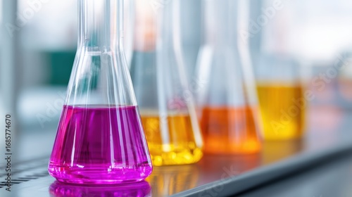 Colorful laboratory glassware with vibrant liquids in a modern lab setting, showcasing scientific exploration