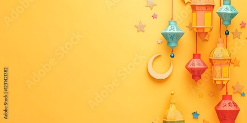 Colorful lanterns and crescent moon on a bright yellow background for festive decoration.
