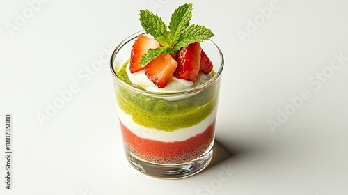 Colorful Layered Dessert with Fresh Strawberries and Mint Garnish