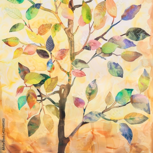 Colorful leaves on a tree in watercolor painting, nature art