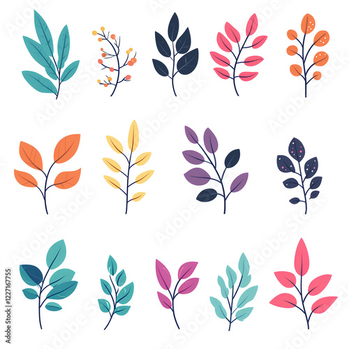 Colorful leaves set isolated on a white background, a collection of green and pink autumn foliage elements for decoration or design concepts. Vector illustration. Flat lay. Isolated. Top view.