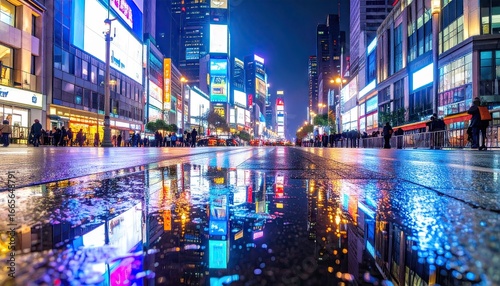 Colorful Light Reflections on Wet City Pavement at Night