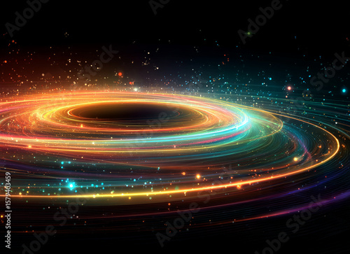Colorful light trails swirling around a dark center in a galaxy with scattered stars around it