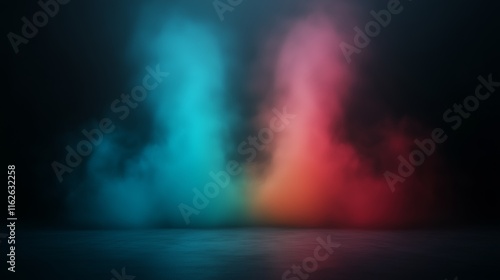 Colorful lights pierce through thick fog, creating a mesmerizing and mystical atmosphere