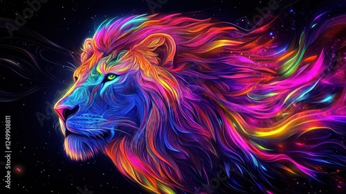 Colorful lion, cosmic mane, space background, fantasy art, graphic design