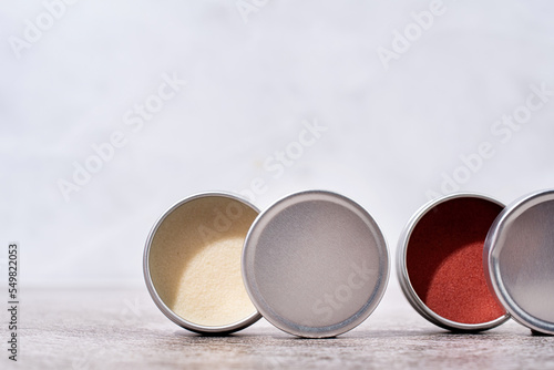 colorful lip balms in round tin cases , mockup design