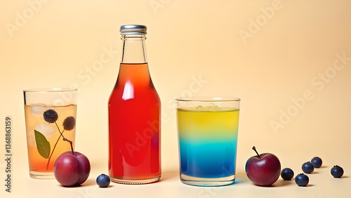 Colorful Liquids in Glass Bottles on Beige Background for Vibrant Presentation