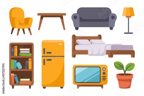 Colorful living room furniture icons, armchair, table, TV, fridge, plant, bookshelf, modern vector, home essentials