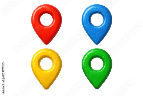 Colorful location pin icons symbolizing worldwide positioning, marking destinations against transparent backdrop