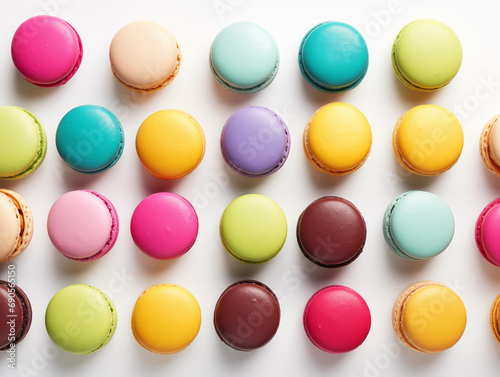Colorful macarons arranged in a pattern, isolated on a transparent background.