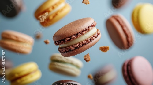 Colorful Macarons Falling on Blue Background