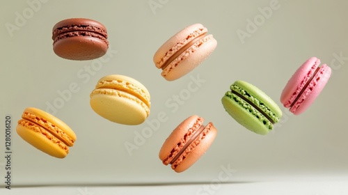 Colorful Macarons Floating in Air Against Soft Background
