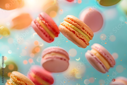 Colorful macaroons flying in the air on background.