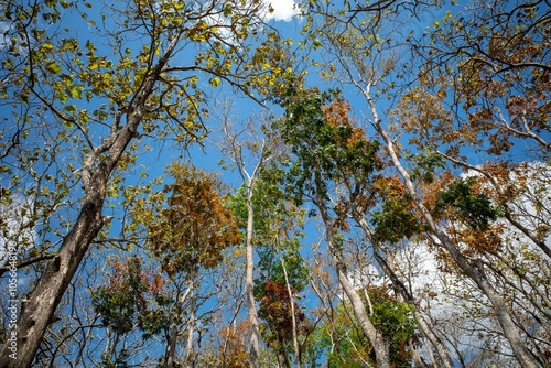 Colorful Mahogany leaves, Swietenia macrophylla forest in Gunung Kidul, Yogyakarta, Indonesia